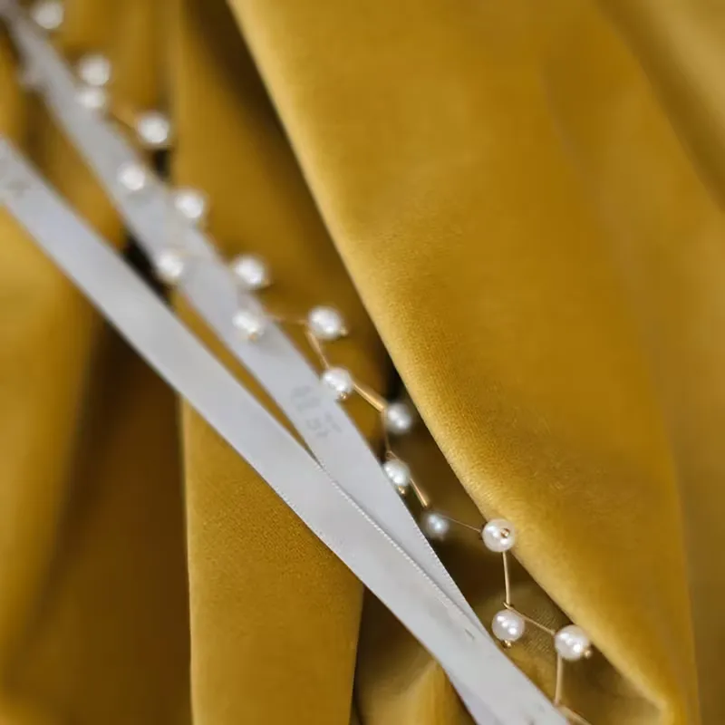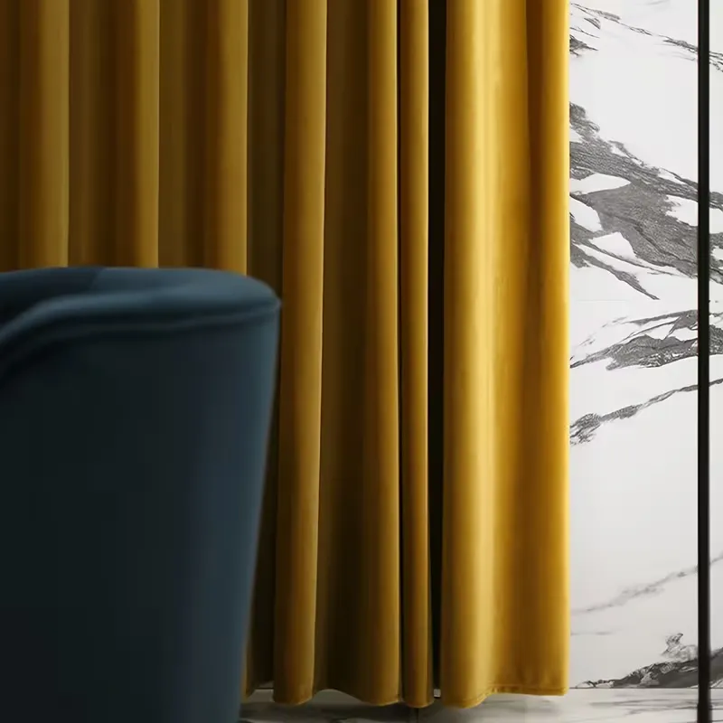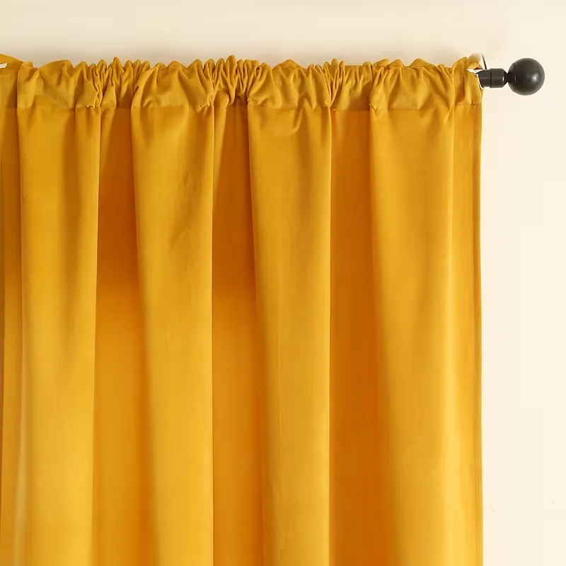 Latest gold-colored velvet curtains with rod pocket design for easy hanging. Soft, ready-made fabric enhances privacy while creating a luxurious and elegant atmosphere. Perfect choice for living rooms and bedrooms seeking a rich and stylish interior touch.